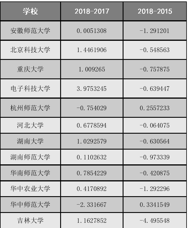 “中国大学进退步排行榜(一年版:2017-2018)”、“中国大学进退步排行榜(三年版:2015-2018)”和“排名不稳定的大学名录”所收录的高校至少在前文提到三个排名榜单中出现,对于它们的计算原则依据:未出现在另外榜单中,依零分计入。