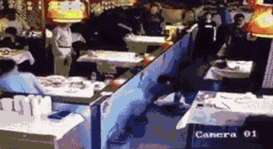 监控画面显示,6:15分,餐桌对面的周凯旋突然起身,将一把匕首插入谢雕左胸,又迅速抽出去。谢雕低头看一眼胸口,血已经把白T恤染红,他双手捂住伤口,晃晃悠悠站起来,曲着腿后退几步。