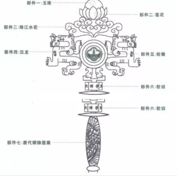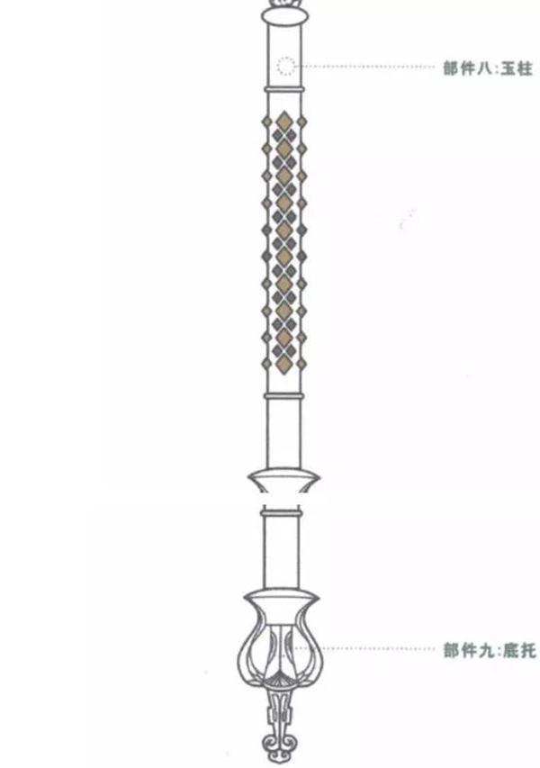 权杖底托的设计也颇有意义。中心圆柱形握持部分以战国剑器柄为设计原形。以剑气之豪情收拢权杖华贵之形,使权杖华贵中不失英武阳刚之权力力量象征。双侧围绕一鸾一凤之形,鸾翔凤集象征着人才荟萃。