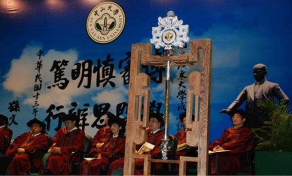 中大目前使用的权杖是2006年制作完成并正式启用的,这支雍容典雅、高贵庄重的权杖已经护佑中大走过了十余个春秋,送走了一届又一届卓越的毕业生,现已成为学校学位授予仪式的标志。
