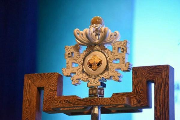 矗立在舞台左侧的权杖,在灯光下闪现银色的光泽,辉映着仪式的庄严和神圣。那支熠熠生辉的权杖总会引来所有人的惊叹。这支权杖其实颇有来头,浑身上下都是珍贵宝物。