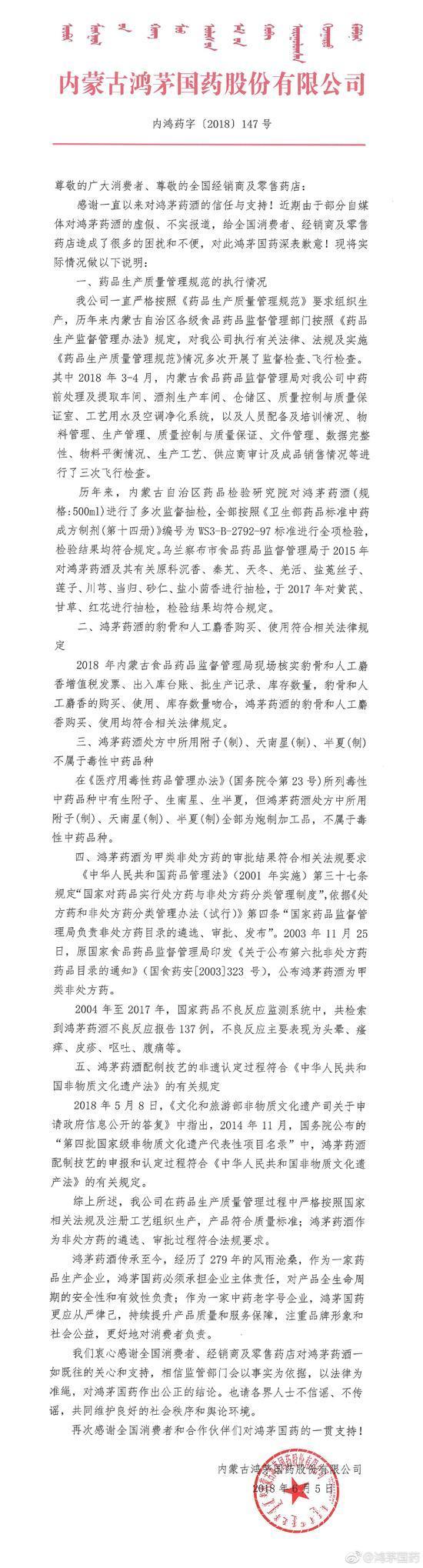 我们衷心感谢全国消费者、经销商及零售药店对鸿茅药酒一如既往的关心和支持,相信监管部门会以事实为依据,以法律为准绳,对鸿茅国药作出公正的结论。也请各界人士不信谣、不传谣,共同维护良好的社会秩序和舆论环境。