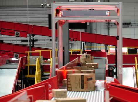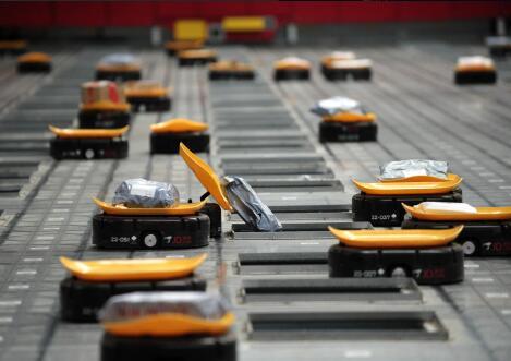 京东济南物流中心的矩阵滑槽可自动分拣大件商品