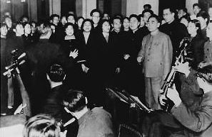 1949年10月1日,毛泽东主席在天安门城楼上正式宣布,中华人民共和国中央人民政府今天成立了!当时,在现场参加开国大典的作曲家王莘热泪盈眶,激动的心情不知该如何表达。回到天津的家后,他告诉妻子王惠芬,自己一定要写一首歌颂祖国的歌,并开始构思,如何将心中的感受用音乐表达出来。
