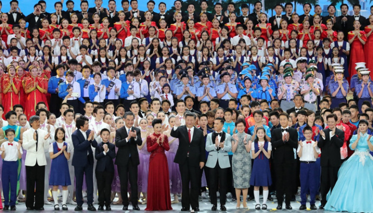2017年6月30日晚,中共中央总书记、国家主席、中央军委主席习近平在香港会展中心观看《心连心⋅创未来》庆祝香港回归祖国20周年文艺晚会。晚会最后,习近平走上舞台,同主要演职人员一一握手,并同全场一起高唱《歌唱祖国》,祝愿伟大祖国繁荣昌盛,祝福香港明天更加美好。
