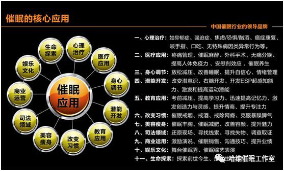 除了被广泛应用于商业广告领域,催眠还是治疗心理疾病的一种重要方法,包括诸如焦虑、抑郁、恐惧、强迫症、癔症等心理障碍。催眠师针对患者的具体情况,通过催眠手段将患者引导进入一种特殊的意识状态,为患者的潜意识提供适当的沟通、诉求及自我表达的机会,以转化和消除失衡的心理状态,从而产生治疗效果。