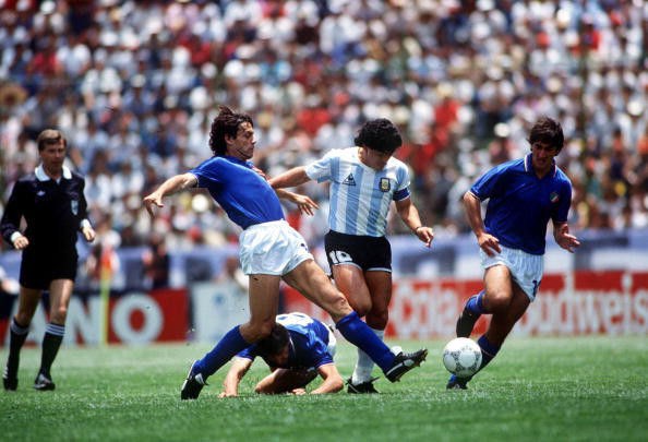 四年之后,他又以卫冕者的角色参加了世界杯的比赛。这届世界杯的举办地在意大利,当时马拉多纳正在那不勒斯队效力,其间他帮助该队赢得了两次意甲联赛冠军和一次欧洲联盟杯冠军(UEFA Cup)。尽管由于严重的踝伤他的体力有所下降,但作为领军人物,他所保持的强烈的求胜欲望帮助他的球队一一战胜了巴西队、南斯拉夫队和意大利这些强硬的对手。然而布雷默(Andreas Brehme)的点球帮助德国队最终夺冠。