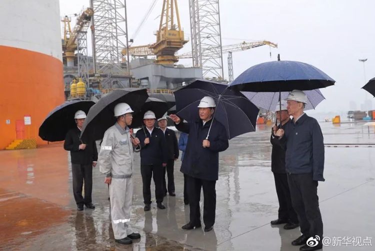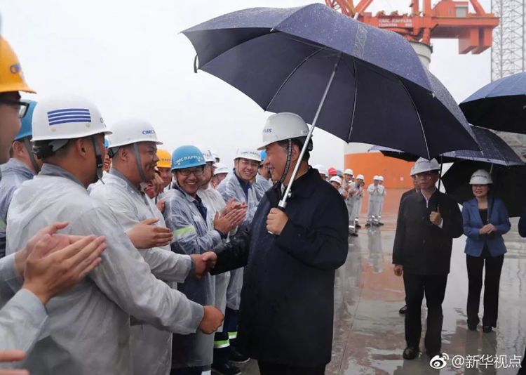 △习近平冒雨考察中集来福士海洋工程有限公司烟台基地