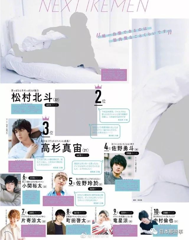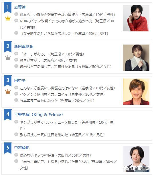 第一名的大灰人是最近话题度颇高的平野紫耀,榜上还有高杉真宙、佐野勇斗、片寄凉太这些我们熟悉的若手新星。