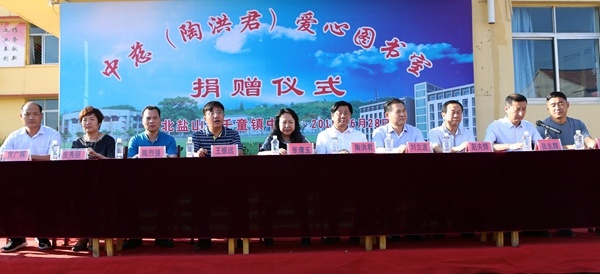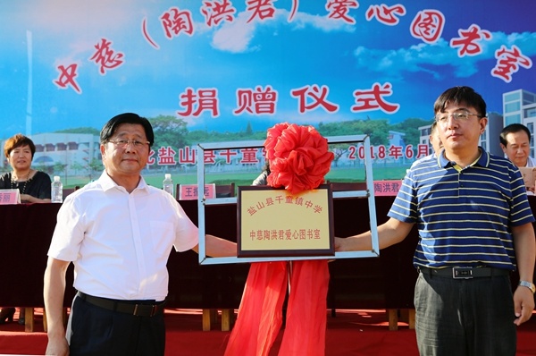 (夏欣 摄影报道)2018年6月28日,“中慈陶洪君爱心图书室”捐赠仪式在河北省盐山县千童中学举行。中国慈善总会大众慈善促进委员会执行会长张倩玉、中国亚洲经济发展协会华夏文化艺术委员会会长陶洪君、副会长刘立波、陶烈强,盐山县委常委、宣传部长王振远、副部长张秀丽、盐山教育局副局长张义忠出席仪式。本次活动向盐山县千童中学无偿捐赠了3700册价值10万元的爱心图书。