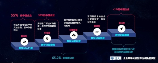 根据企业数字化转型评估成熟度模型,数字化转型可以分为五个阶段:入门者、探索者、参与者、转型者、颠覆者。目前中国85%的企业分别处于第一、第二阶段,只有1%的企业,即最早一批的转型者,正扮演颠覆者的角色。相比美国,其65.2%的企业正处于第二、第三阶段,互联网企业已进入数字化转型成熟阶段。