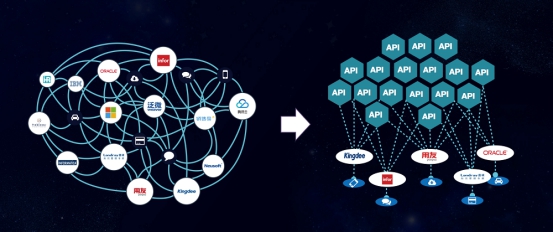 早期的企业IT架构为打通系统孤岛,各个系统间采用单点连接方式。随着系统越来越多,这种集成方式演变成复杂的“蜘蛛网”,带来了操作复杂、敏捷度低等困扰。