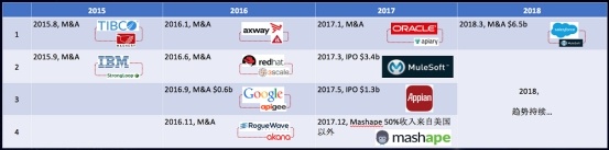 API并非是新概念,从2015年开始,海外API市场的投资与并购如火如荼,例如:提供企业软件集成服务的Mulesoft,2017年于纽交所上市,市值超过34亿美元,2018年3月,被Salesforce以65亿美元收购。