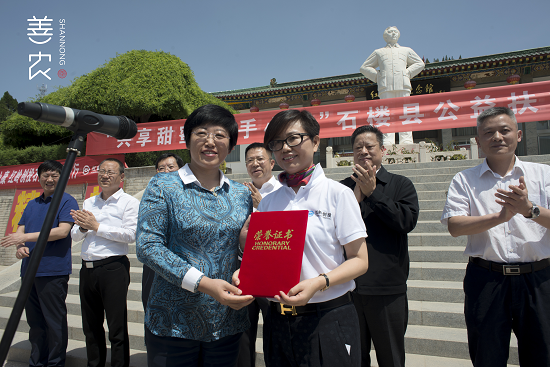 (石楼县政府副县长呼鹏燕向山西善农蜂业董事长罗茵颁发了荣誉证书,向其对石楼经济推进和蜂农脱贫做出的突出贡献表示认可和赞誉。)
