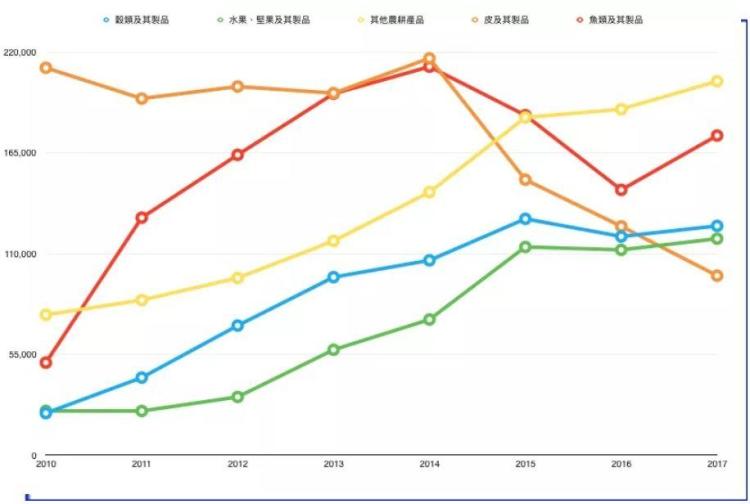 相比之下,一向为台湾农产品出口目标国的日本,10年间并无明显增长,维持在8-9亿美元之间,中国香港波动幅度较大,在3-5亿美元之间。