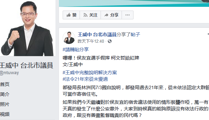 王威中7月4日在脸书(Facebook)粉丝页分享文章称,台北都市发展局已经表示,过去21年来从未依法认定涉事建筑可当作寄宿住宅。