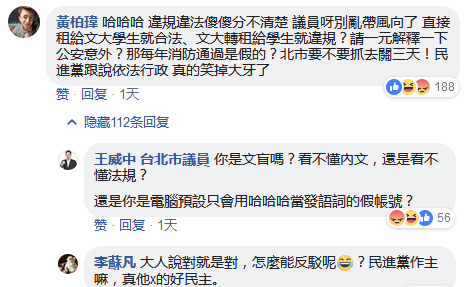 面对王威中“义愤填膺”的发言,有网友质疑:“哈哈哈 违规违法傻傻分不清楚 议员呀别乱带风向了 直接租给文大学生就合法、文大转租给学生就违规?请一元(议员)解释一下 公安意外?那每年消防通过是假的?北市要不要抓去关三天!民进党跟说依法行政 真的笑掉大牙了”。