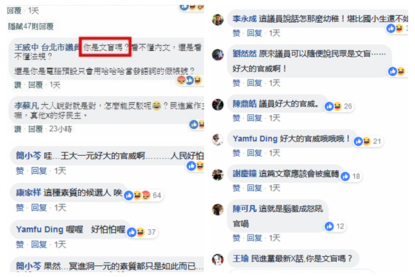 “哇…王大一元(议员)好大的官威啊………人民好怕怕喔”