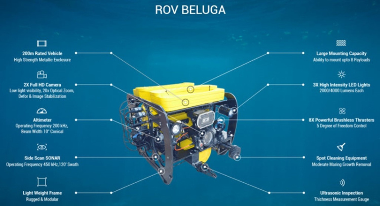 公司的最新款设备Beluga可以配备各种仪器设备,包括用于测量金属厚度的超声波测厚仪和一些无需太高技术的小型设备,如用于清洁金属表面的旋转刷。
