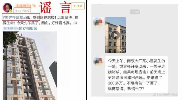 【传闻】6月17日到19日,海南琼海、四川成都、江苏南京等地微博、微信群、朋友圈流传着不同版本“世界杯赌球输钱跳楼”的视频和文字消息,视频内容是不同的“跳楼自杀现场”,配发的文字是“某地一男子赌球跳楼”“一男子连续赌球赔了300多万一了百了”等内容。