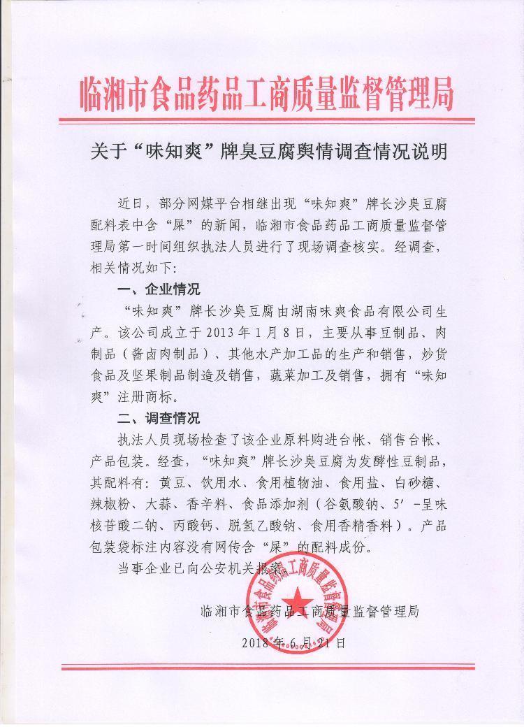 【真相】6月22日,湖南省临湘市食品药品工商质量监督管理局在临湘市政府官网上回应,经执法人员现场查看,“味知爽”牌臭豆腐配料不含“屎”,产品包装袋标注内容没有网传含“屎”的配料成份。当事企业已向公安机关报警。