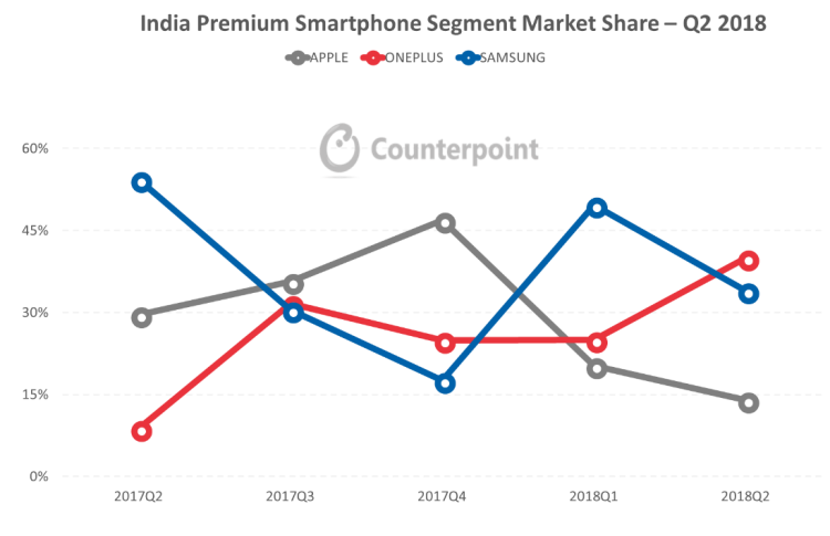 Counterpoint数据显示,2018年第二季度,整体高端智能手机市场同比增长了19%,环比增长10%。三星、一加和苹果这三大品牌占据了整个高端市场88%的份额,其中一加以40%的市场份额成为印度高端手机市场第一(大于30000卢比,约3000元人民币),超越了三星34%的份额和苹果14%的份额。这一成绩归则需要归功于一加6成为第二季度高端手机市场中最畅销的机型。