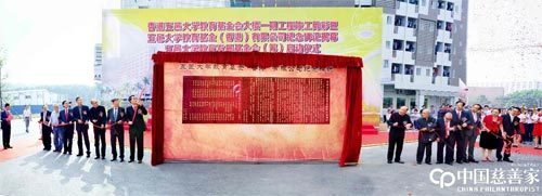 上世纪80年代吕志和便开始捐助内地教育事业,1987年他捐资300万港元给五邑大学。图为2014年,吕志和出席香港五邑大学教育基金会大楼一期工程竣工剪彩暨五邑大学教育基金(香港)有限公司纪念碑记揭幕仪式。