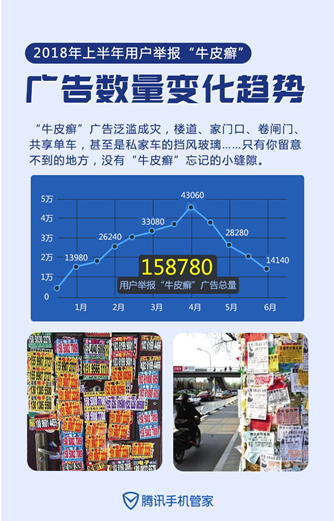泛滥成灾的牛皮癣小广告令用户深恶痛绝,腾讯手机管家的“举报街边牛皮癣”功能成为反击利器。报告数据显示,2018年上半年,用户举报牛皮癣小广告总量近15.88万,其中4月达到单月举报量高峰,达4.31万。