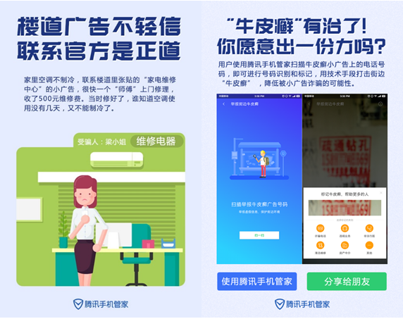 整治城市牛皮癣小广告势在必行。为了从源头上打击牛皮癣小广告黑产,腾讯手机管家今年年初上线“举报街边牛皮癣”功能,用户通过扫描牛皮癣小广告上的电话号码即可进行诈骗号码识别,并可选择“诈骗电话”、“违规业务”、“非法行医”、“清洁维修”、“房产中介”等类型进行标记;若用户扫描的号码是诈骗电话,系统会自动提示。