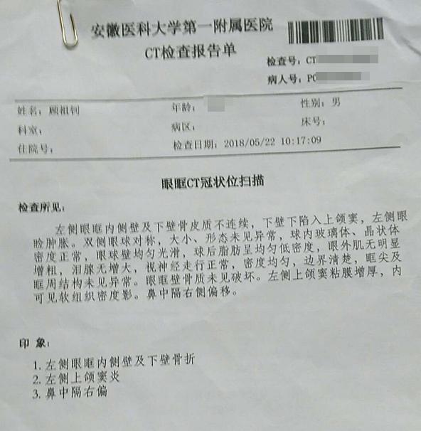 顾祖钊还向澎湃新闻表示,事发后他已经在合肥和上海的多家医院进行治疗。7月8日,他向澎湃新闻提供了安徽医科大学第一附属医院5月22日的CT检查报告单。报告单显示,顾祖钊左侧眼眶内侧壁及下壁骨折、左侧上颌窦炎、鼻中隔右偏。