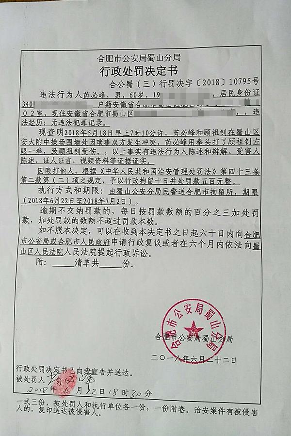 另据澎湃新闻获得并证实的《合肥市公安局蜀山分局行政处罚决定书》(合公蜀(三)行罚决字【2018】10795号),合肥市公安局蜀山分局查明:2018年5月18日早上7时10分许,芮必峰和顾祖钊在蜀山区安大附中操场围墙处因琐事双方发生冲突,芮必峰用拳头打了顾祖钊左眼一拳,致顾祖钊受伤。以上事实有违法行为人陈述和辩解、受害人陈述、证人证言、视频资料等证据证实。