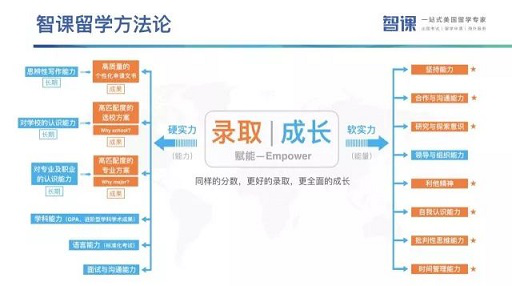 智课将学生留学能力的提高分为软硬两种实力,前者包括学生在合作与沟通、领导与组织,以及时间管理等方面的八项能力,后者则包括学生的批判性写作能力、口语交流能力,以及对院校和专业的信息收集能力。