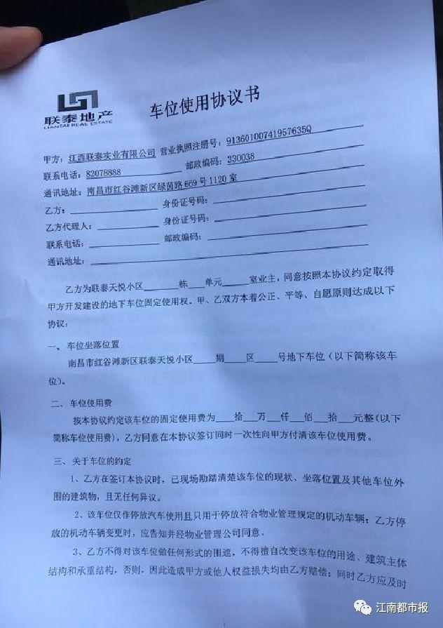7月10日,江南都市报全媒体记者从联泰天悦出具的《车位使用协议书》上看到,开发商向小区业主协议出让地下车位固定使用权,业主须一次性付清车位使用费。关于车位权证办理,该协议书注明,南昌市尚未出台办理地下及半地下车位产权证、土地证和车位使用权证的政策,不能办理该车位产权证、土地证或车位使用权证。协议还注明,车位使用年限自协议签订之日起至2076年。