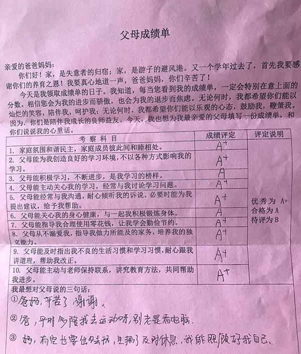 “每当您面对孩子成绩单,可能会特别在意上面的分数。相信您会为孩子的进步而骄傲,也会为孩子的退步而焦虑。家长是孩子的第一位老师,也是陪伴孩子的良师益友。当家长在评判孩子的同时,可知道,在孩子的心里,也会对自己的父母有一个评价。”伴随着这份成绩单的还有一封学校致家长的信。信中谈到了此举背后的初衷——为了帮助家长们更加客观地看待自己的教育方法,积极与学校展开合作。