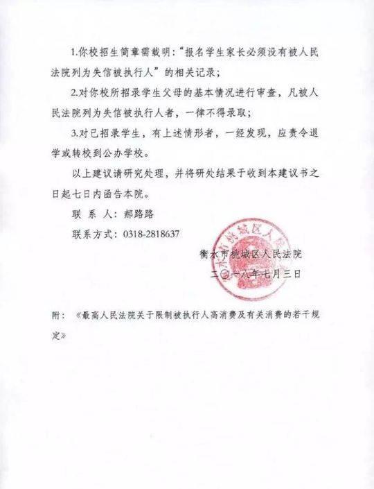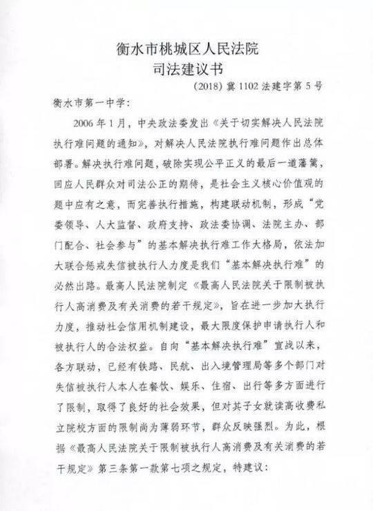 “父母失信,子女上学受限”,这让人不禁联想到了近日河北衡水桃城区法院的一封司法建议书,该院向衡水市第一中学、衡水中学实验学校等辖区内所有相关学校发出司法建议,对被列入失信被执行人的子女就读高收费学校进行限制。