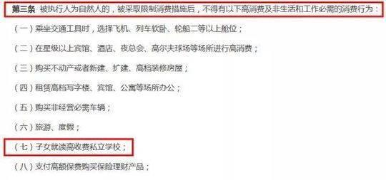 2016年9月中共中央办公厅、国务院办公厅印发的《关于加快推进失信被执行人信用监督、警示和惩戒机制建设的意见》进一步明确:限制失信被执行人及失信被执行人的法定代表人、主要负责人、实际控制人、影响债务履行的直接责任人员以其财产支付子女入学就读高收费私立学校。