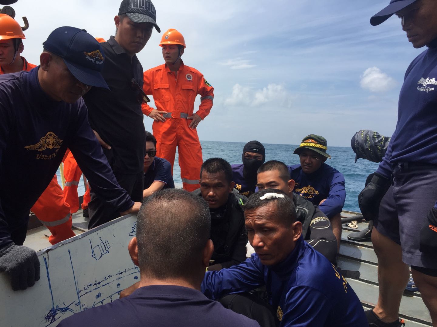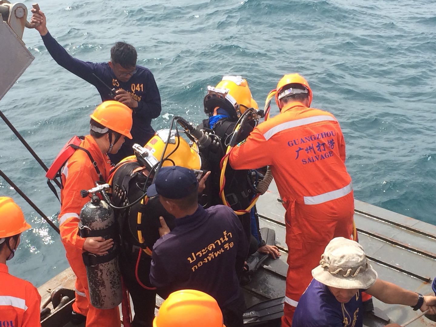 中国广州打捞局的救援人员与泰国海军潜水员在海上共同进行搜救。本报记者孙广勇摄