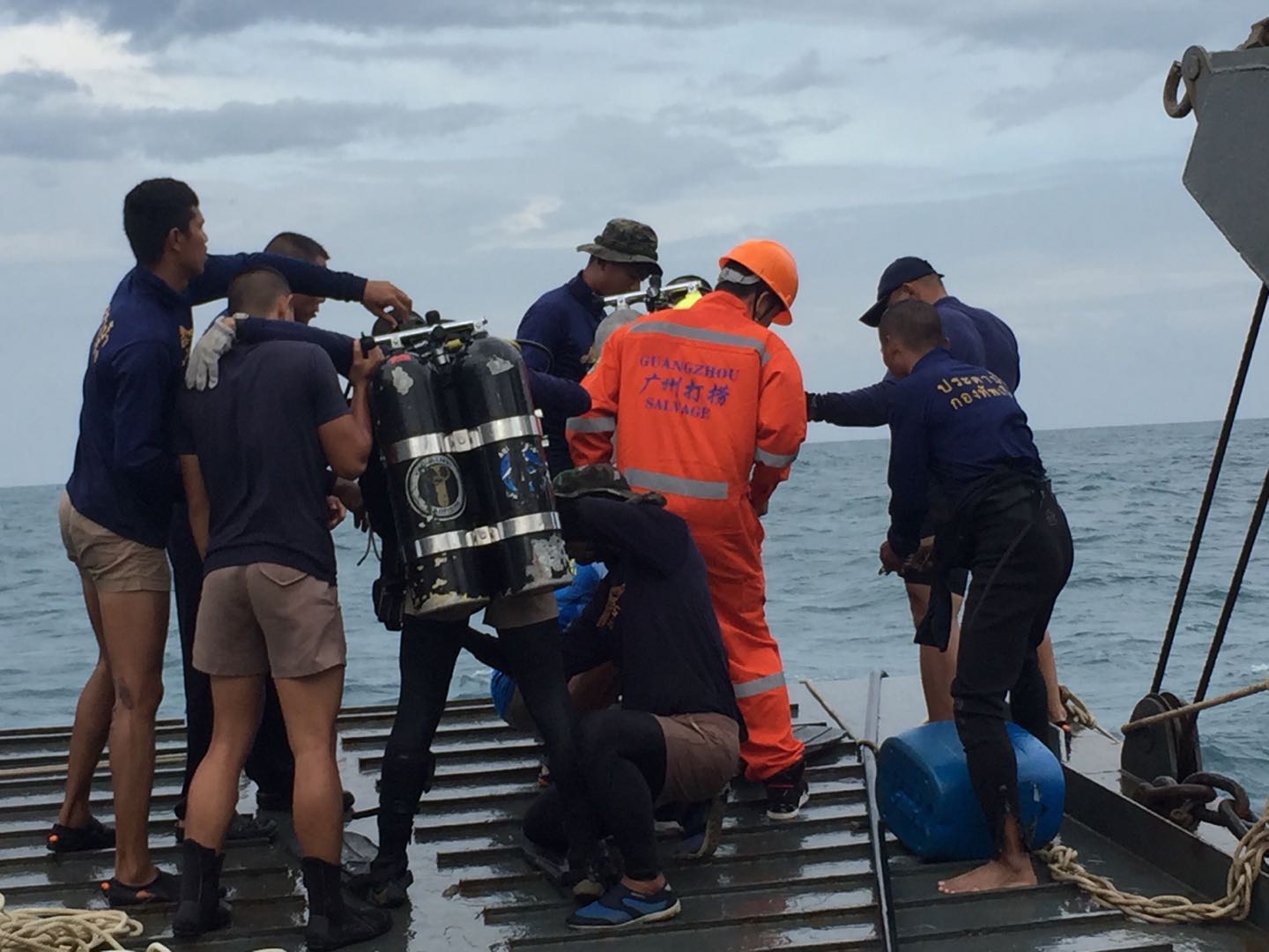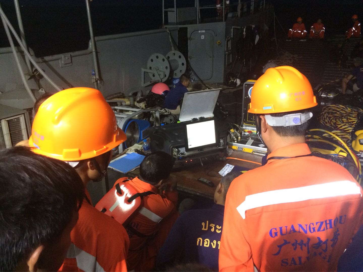 天色越来越暗,安达曼海的风浪又起来了,4、5米的海浪拍打着救捞船不断晃动,打捞工作被迫中止,准备返航。潜水员把海下的管道和绳索固定好,设置浮标,氧气瓶充气时发出刺耳的滋滋声,为第二天的潜水做好准备。中泰搜救队坐在一起,讨论第二天的方案。一位救援人员对记者说:“不用报道我们的名字,我们的责任就是救援、打捞,没有时间想其他的,只想着把遗体打捞上来,把每一位遇难同胞带回祖国,这是我们的责任。”