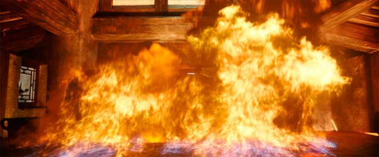 不过,朱潜龙砸破汽油罐的火焰镜头的的确确给“讲究”的特效师带来了不小的“麻烦”。第一个困难之处是,摄像机距离等待制作的CG火焰十分近,就连视效制作成熟的好莱坞影片也极少出现这种近距离;第二个困难点是人物砸坏汽油罐子的动作速度极端之快,为动力学解算造成了很大的阻力。