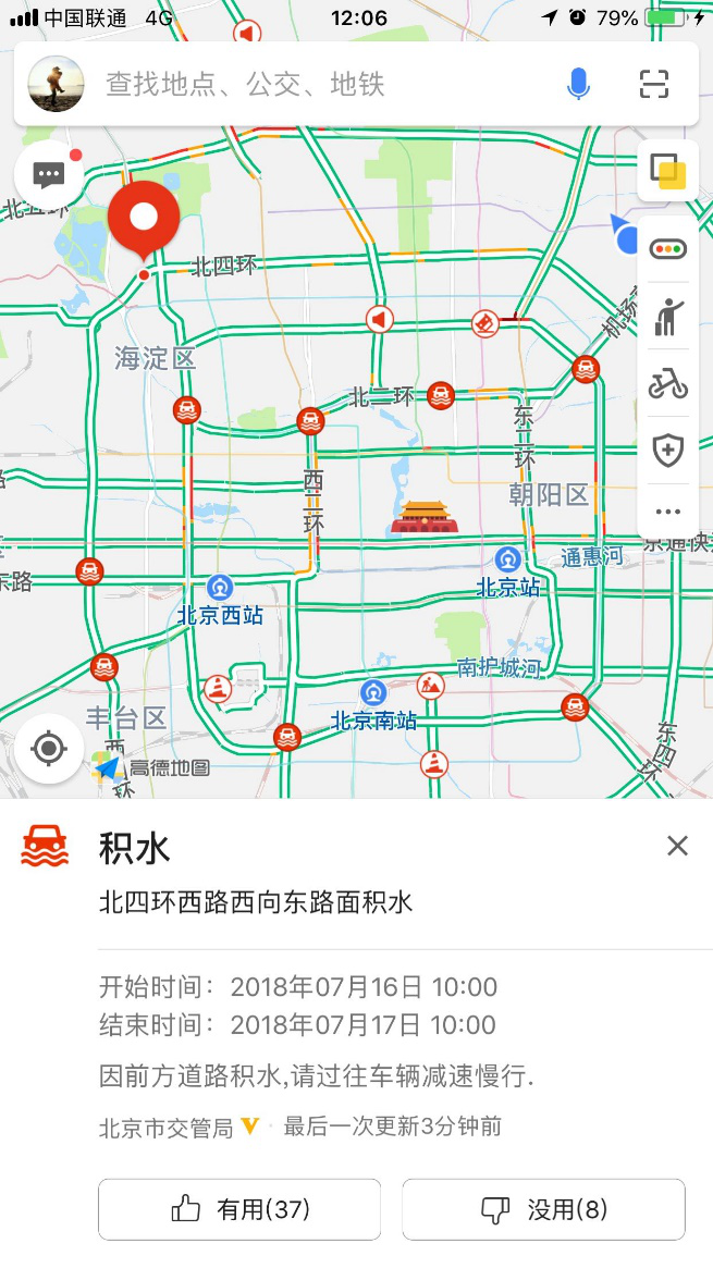 高德积水地图显示,北京城区不少路段产生严重积水,地图上出现了大量“积水事件”。其中,上地东路、回龙观育知东路、回龙观建材城东路等路段因积水封路,另外,立水桥、霍营地铁站、西二旗地铁站、学院路机动车检测厂附近也有严重的道路积水。北京市防汛办也通过高德地图上报了多处积水点:西客站隧道、回龙观、东坝、丰台区部分铁路桥区出现积水。