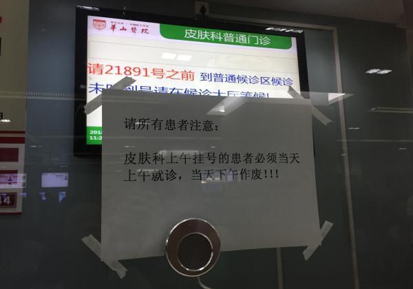 来自医院方面的统计数据显示,7月16日皮肤科普通门诊共放出3750个号源,较平日发放的号源略多。尽管如此,当日上午10点左右,皮肤科门诊挂号窗口陆续有工作人员张贴出告示“上午现场号已满,只挂预约号”。