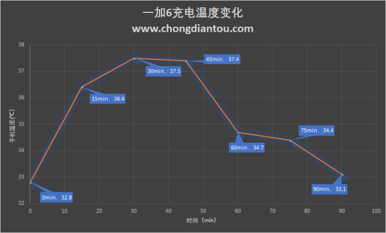 温度方面,使用FLIR测温仪测每隔15min记录一次手机温度。手机在充电之前的温度为32.8℃,随着充电时间的增加,温度逐渐上升,30min后达到37.5℃,并开始回落。充电前30min的温度呈上升趋势的原因则是因为这段时间内手机处于持续大功率充电状态,之所以在30min后温度开始渐渐回落,原因是因为之后随着充电功率减小,手机温度也处于缓慢降低。