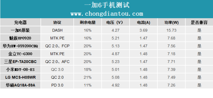 根据图表可以看出,一加6除了与自身原装的充电器可以进行快充之外,其余协议的充电器均不支持给一加6快充。