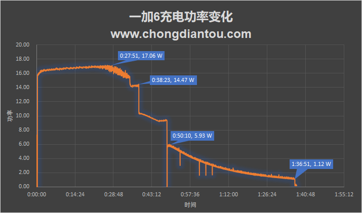 从图表中可以看到,一加6刚开始充电的时候功率会逐渐增加到17W左右,随着电量的增加,在28分钟左右功率开始呈阶梯下降,