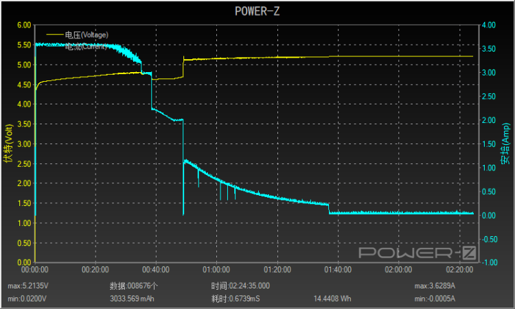 从POER-Z KM001记录下的充电曲线可知,一加6整个充电变化情况大致可分为:22分钟前、22分钟至38分钟、38分钟至65分钟,65分钟至1小时35分钟,电流根据时间的变化分别从最高的5.5A依次降到3.8A、2.5A,最后因为电量充满降到了1.2A。