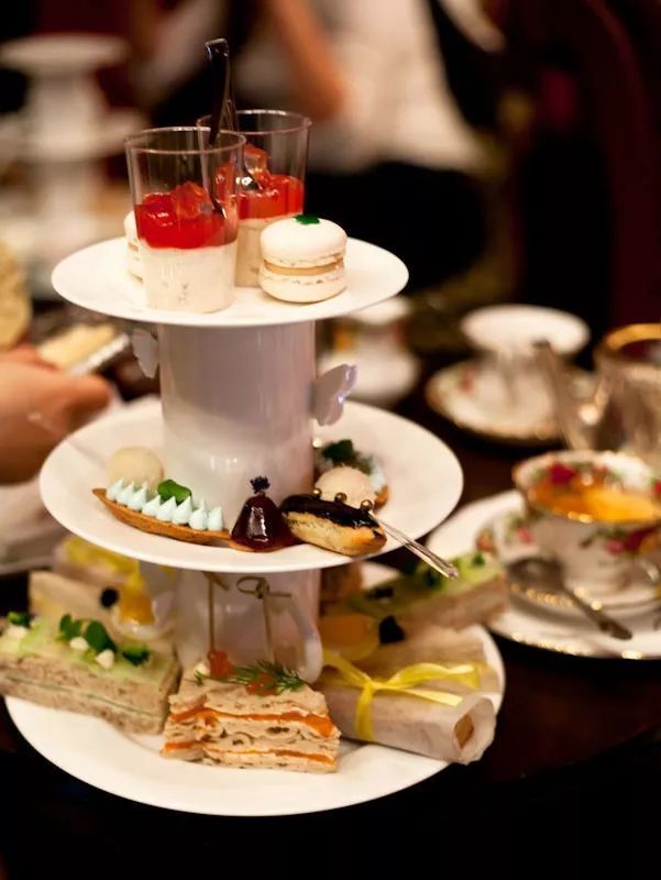 茶点的吃法也不能马虎,自下而上、由咸到甜,吃一口三明治配一口茶,再品尝一口涂抹了黄油或者果酱的司康饼,最后享用一下甜腻厚实的水果塔,这才算是完成了下午茶的整套程序。