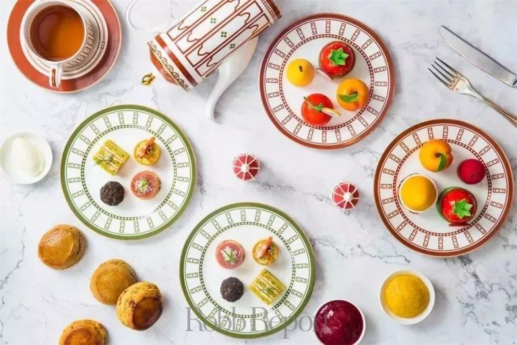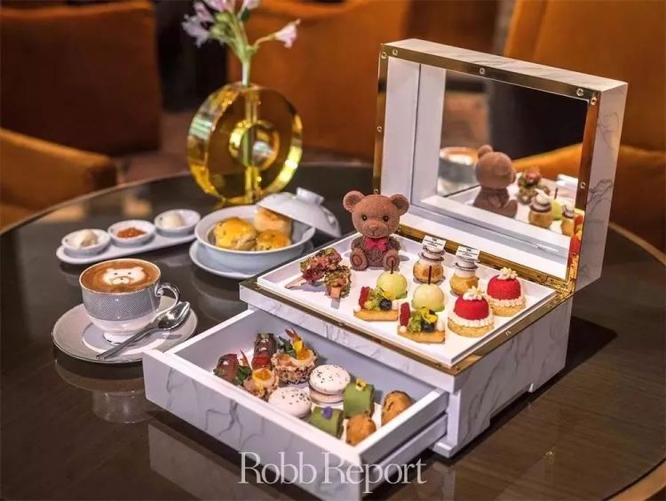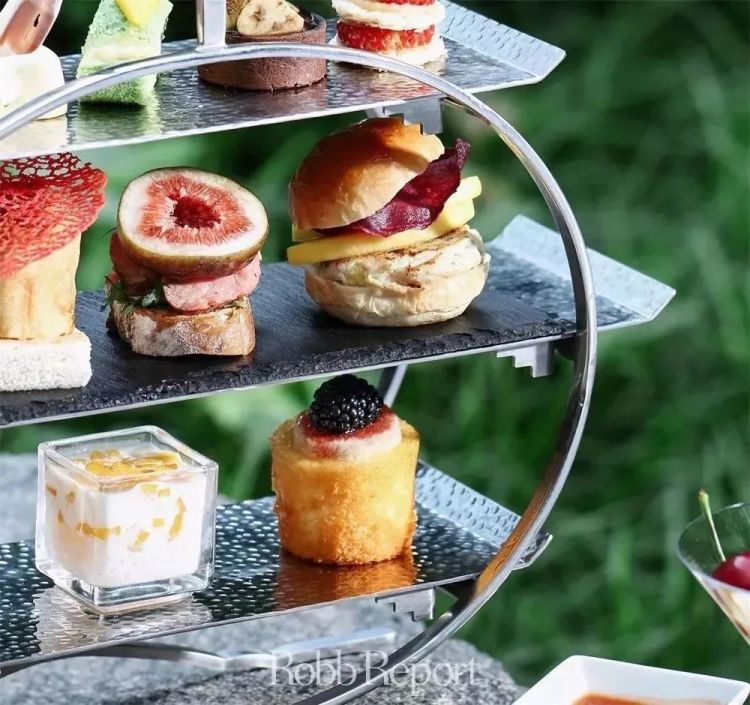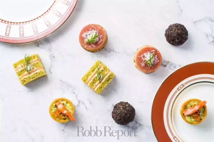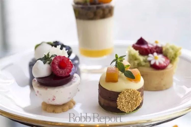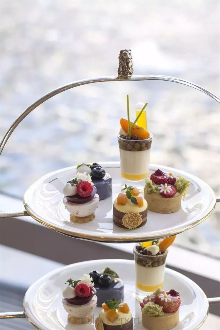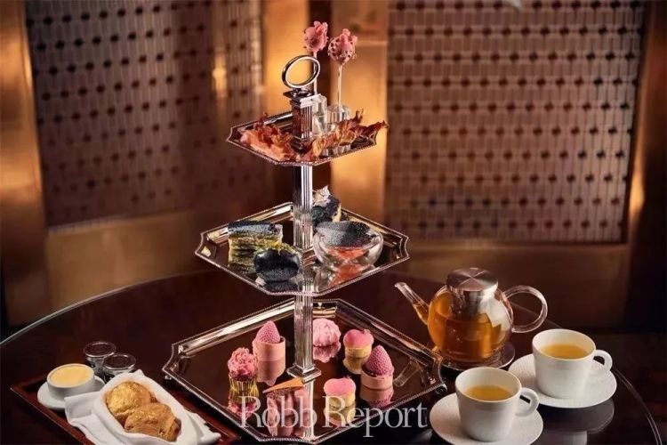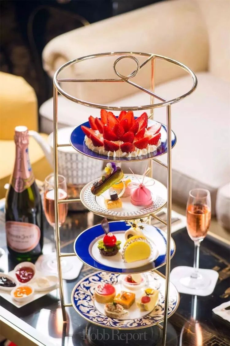 “雅致珠宝”下午茶包含一系列精选美食,玫瑰樱桃酱蛋白脆饼、草莓奶酪杯装蛋糕、新鲜烘焙的英式葡萄干松饼等甜口美食,搭配英式莳萝青瓜三明治配贝加尔鱼子酱、烟熏培根千层苏纽文条等咸口小食。让这套下午茶套餐呈现了不同层次的口感。