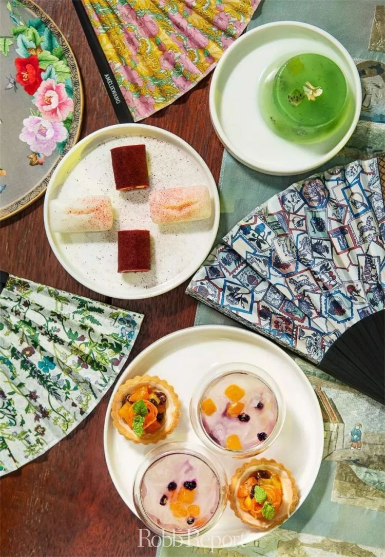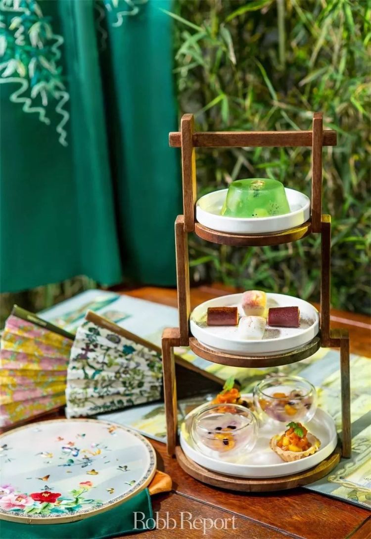 下午茶以Amelie Wang的最新设计为灵感,三层设计搭配中式甜品,颇有创意。与英式下午茶不同,这款下午茶的品尝顺序由上到下。第一层为清爽可口的青柠薄荷猕猴桃果冻,第二层是软糯香甜的传统乡村风味米糕和香草栗子甜菜根毛巾卷,最后一层则是滋补养颜的黑枸杞木瓜炖银耳配玉桂烩胡萝卜及混合水果塔。