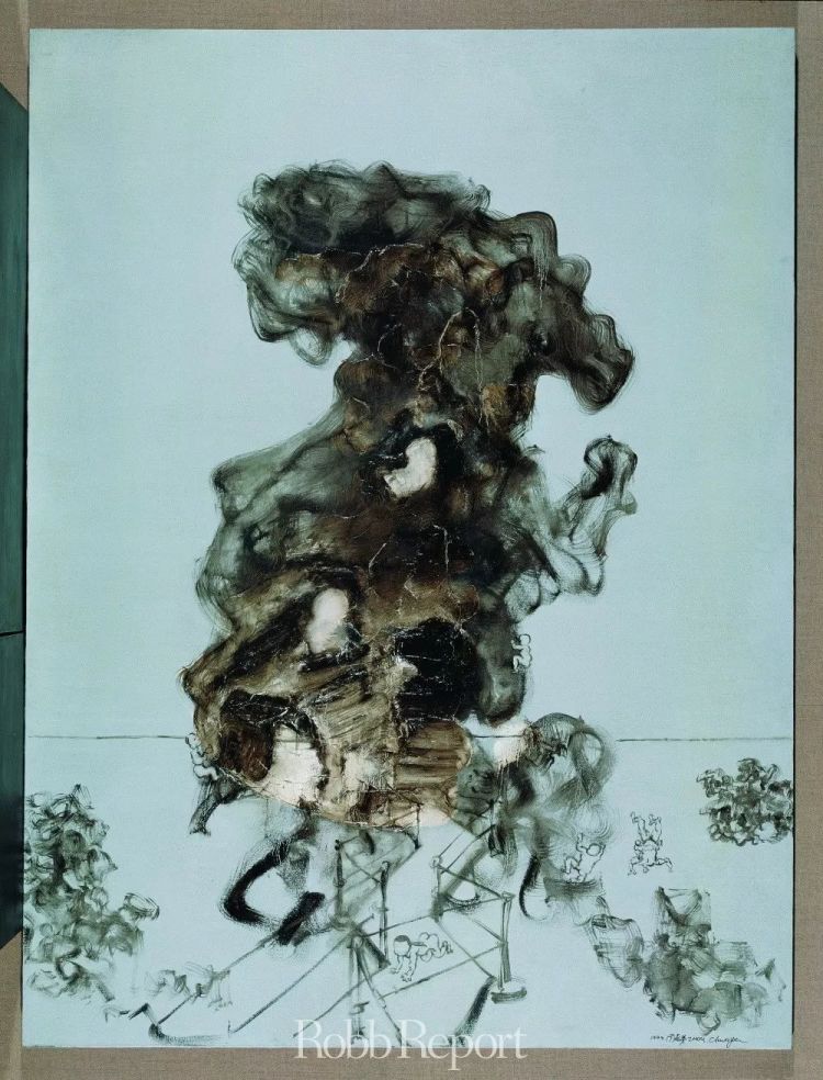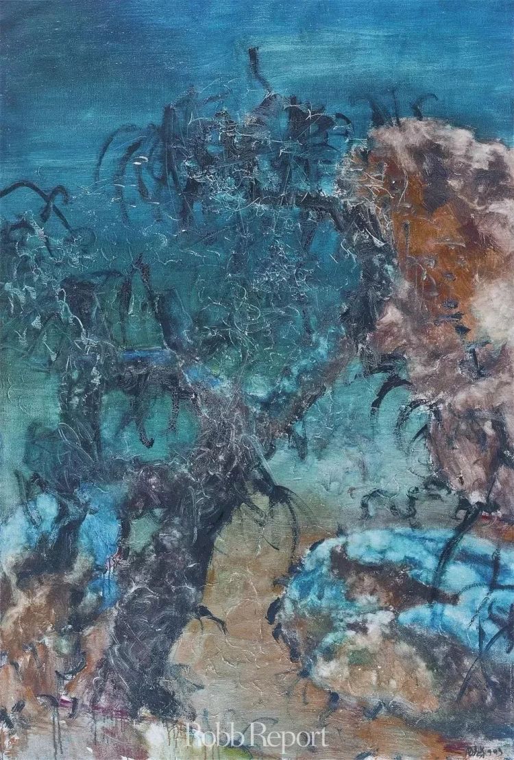 比如最为大众所熟知的桃花系列作品,流淌在画布之上满目深深浅浅的桃粉色,绚丽浓烈,不若“桃花带雨浓”那般娇羞,而是以令人血脉贲张的妖冶“占断春光”。还有同样在艺术家生涯中具有标志性意义的绿狗系列,尽管采用了象征宁静、浪漫与抒情的绿色,却以狗之龇牙咧嘴的狞厉状态释放出动物原始的野性欲望气息。就连那千古沉默的石头到了他笔下,也从凹凸有致的轮廓中渗出几抹吊诡的猩红,仿佛一副沉睡隐忍多时的老灵魂发出暗哑低沉的嘶吼。
