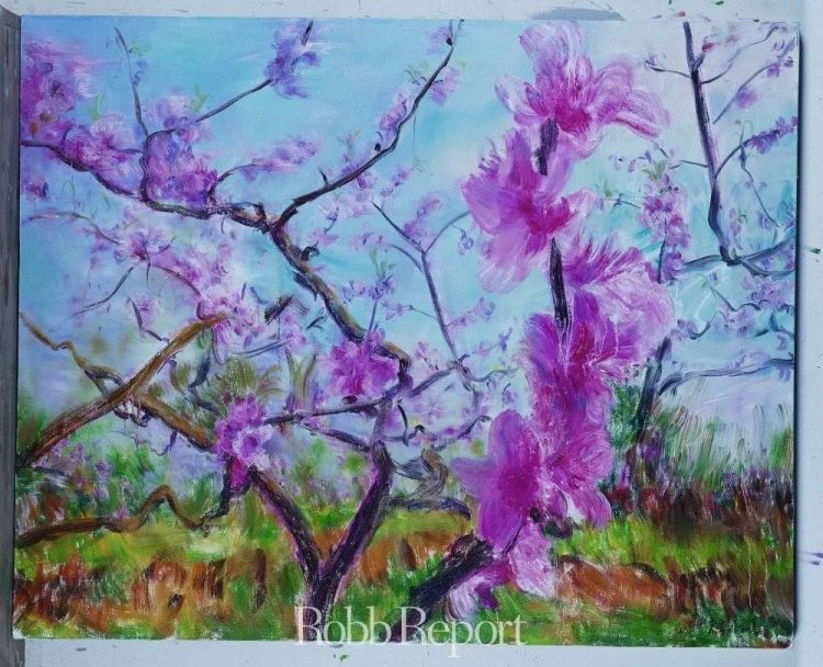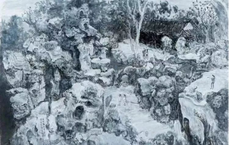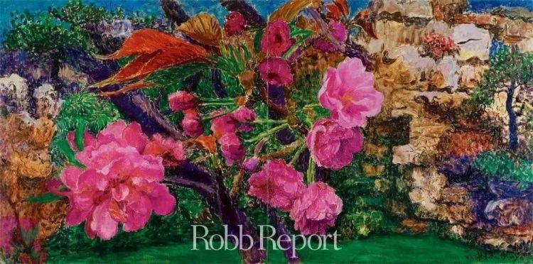 桃花之后园林成为了周春芽创作的又一主题,褪去艳丽妖娆的红,取而代之以大面积的紫,画面变得更为平稳,透出游山玩水之安逸。大众自然地将画中韵致与艺术家的生活联系起来,周春芽自己也应和道:“人老了,现在家庭也比较平稳,两个儿子这么小……”而当你以为看懂了他园林系列作品中所追求的平静安稳,他却忽然话锋一转:“但是说不清楚,我还有几十年要活,说不定园林里面暗藏杀机。”他身子微微前倾,眼睛里透出几分孩童般的兴奋与狡黠:“就像上海的豫园,里面很丰富、很复杂的,暗藏各种阴谋阳谋,以前小刀会的总部就在这个园林里面,经济交往、政治斗争、艺术品交易都曾在这儿发生。所以不要小看园林的平静,它里面是充满杀机的。”